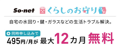 | おすすめ料金プラン (マンション) | So-net光プラス: 1~24ヶ月目 2,728円 25ヶ月目以降 4,928円 |