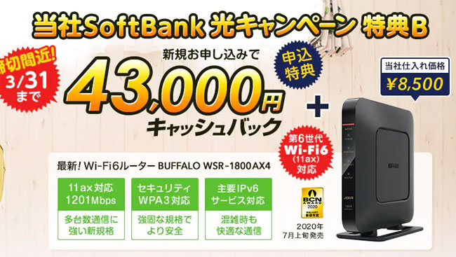 ソフトバンク光代理店のエヌズカンパニーでは、新規契約の方向けにキャッシュバック+IPv6対応ルーターの無料レンタルを行っているので、自前で用意したくないという方はそういったキャンペーンを利用してみると良いでしょう。